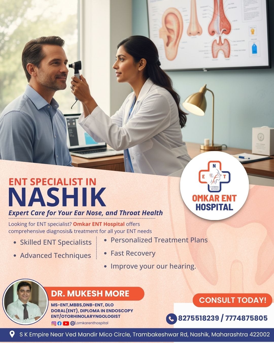 At Omkar ENT Hospital, patients with chronic ear infections or perforated eardrums are often guided through this procedure in a simple and reassuring way. Tympanoplasty focuses on repairing the eardrum, which helps in improving hearing and preventing repeated infections. It’s not just about fixing the ear, it’s about restoring a sense of normalcy in daily life.