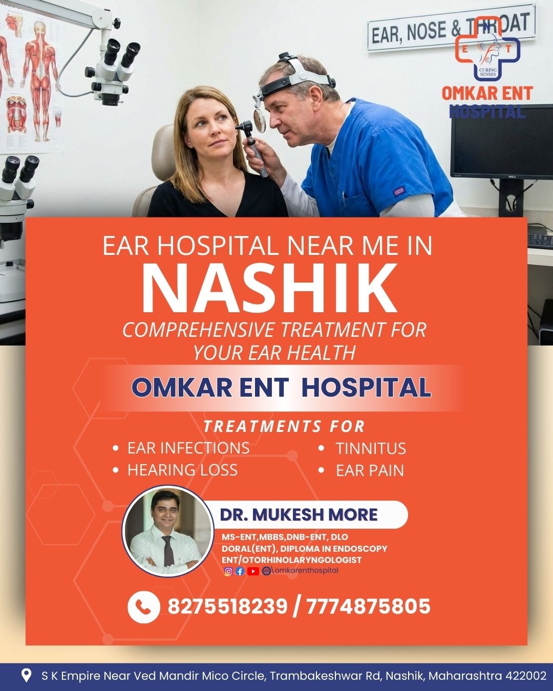 If you're in need of an ENT specialist near me in Nashik, Omkar ENT Hospital is your trusted destination for comprehensive ear, nose, and throat care. Our team of expert ENT specialists in Nashik is dedicated to helping you manage and treat a wide range of ENT issues, from simple ear infections to complex conditions like sleep apnea and sinus disorders.